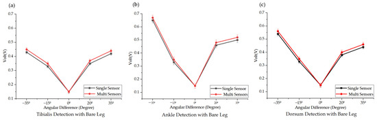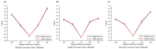 The experimental results under the blanket-covered conditions and comparison of signal detection at the (a) tibialis anterior, (b) ankle, and (c) dorsum of foot using a single sensor versus three synchronized sensors.