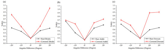 In this experiment, we focused on using multiple TENG sensors to detect and compare signal variations between bare-leg and blanket-covered conditions. Specifically, we analyzed the signals from three monitoring points on the leg to evaluate the impact of different conditions on signal strength and variability. Under bare-leg conditions, the signal transmission was more direct, allowing for clearer charge generation and collection effects. In contrast, under the blanket-covered conditions, the friction between the blanket and the legs led to variations in the signals. These changes can significantly affect the accuracy of assessing PLMS. Figure 7 illustrates the comparison of muscle movements between the bare-leg and the blanket-covered conditions, revealing the significant impact of the blanket on the tibialis muscle, particularly during larger angle changes. When the dorsiflexion angle reached 35°, the signal detected from the tibialis muscle under the blanket condition was approximately double that under the bare-leg conditions. Similarly, at a plantar flexion angle of 35°, the signal was about 2.3 times greater under the blanket. For the ankle, the signals at all four angles increased under the blanket-covered conditions. Notably, when the dorsiflexion angle was at 35°, the change in the ankle signal was minimal in both conditions, with only a 5% increase under the blanket. However, at a dorsiflexion angle of 15°, the signal from the ankle under the blanket-covered conditions was approximately double that of the bare-leg conditions, which may have been due to increased friction between the ankle and the blanket at smaller angles of dorsiflexion. Regarding the dorsum, the blanket significantly amplified the signals during plantar flexion. When the dorsiflexion angle reached 20°, the signal from the dorsum under the blanket-covered conditions was about 2.25 times greater than that under the bare-leg conditions, and at 35°, it was approximately double.
