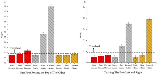 Using only a single sensor poses significant challenges in accurately distinguishing these non-PLMS activities from true PLMS. The signals generated by these non-PLMS activities can easily be misinterpreted as PLMS events. As shown in Figure 8a, when one foot was resting on top of the other under the blanket-covered conditions, there was no significant change in the tibialis signal, with detected values remaining below the threshold. In contrast, both the ankle and dorsum regions showed noticeable signal fluctuations above the threshold, indicating muscle activity. This effect was particularly pronounced in the ankle area, where triboelectric signals were elevated due to the contact between the legs. Under the bare-leg conditions, the dorsum and tibialis regions also detected values below the threshold, while the ankle area displays a clear signal change. In Figure 8b, when the foot naturally turned left and right under the blanket-covered conditions, there was no significant change in the dorsum signal, with detected values remaining below the threshold. However, both the ankle and tibialis sensors recorded noticeable changes in the muscle signals above the threshold, particularly under the blanket-covered scenario. This suggests that the blanket increased friction during foot rotation, thereby amplifying the signals. Under the bare-leg conditions, the dorsum and tibialis regions exhibited detected values below the threshold, while the ankle area demonstrated a distinct signal change above the threshold.