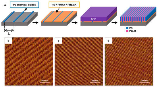 PS-d-PMMA is the most studied and interesting material because it can be easily controlled by heat to produce layered or cylindrical structures. The advantages of this material include that both PS and PMMA have almost the same surface energy at annealing temperatures (190–230 °C), the PMMA domains can be selectively removed, and random copolymers can be used to control interfacial interactions [52,55,56]. For these reasons, various studies have been reported on achieving nano-scale patterns using BCPs based on different monomers [57,58,59].