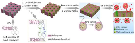 Zhang et al. fabricated positively charged isoporous soft nanochannels using PS-b-P4VP [89]. As shown in Figure 4, the fabricated nanochannels were several tens of nanometers in size, and the pore size could be controlled by adjusting the swelling of the pore-forming block in the working media. Using the fabricated nanochannels, ionic substances such as Mg2+ could be selectively and successfully separated. These nanochannels can be utilized in nanofiltration membranes that can separate various substances with a size of several nanometers and have been widely applied to the separation and identification of substances such as fine proteins [90,91,92]. For example, a study on protein separation using PS-b-P4VP nanochannels that can be manufactured by adjusting the size from 17 nm to 53 nm was reported [150], and a study on separating hemoglobin (6.4 nm × 5.5 nm × 5 nm) and BSA (7 nm × 3.8 nm × 3.8 nm), which have similar sizes, using nanochannels manufactured with a sub-10 nm size was also reported [151].