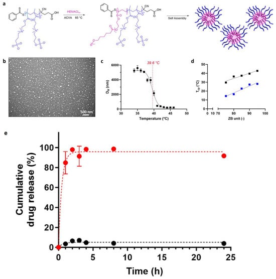 For example, Colli et al. recently reported the fabrication of thermoresponsive drug delivery nanoparticles based on poly(sulfobetaine-co-sulfabetaine) (p(SB-co-ZB)) with extended chains [167] (Figure 10a). The drug delivery of paclitaxel, a common anticancer drug, was tested using the nanoparticles. While more than 95% of the drug was retained under the normal physiological conditions of 37 °C, most of the drug was released under conditions of 43 °C, which satisfies the requirement of hyperthermia, demonstrating that the nanoparticles are an effective drug delivery system (Figure 10c,e).