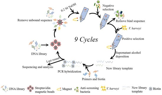 The screening process is shown in Figure 1. The DNA library obtained after PCR contained biotin, which could bind to streptavidin-coated magnetic beads. Negative selection of DNA libraries was conducted by incubation with other bacterial CEMs (P. Fluorescens, V. cholerae, E. tarda, A. salmonicida, and A. hydrophila). The cleaved DNA was removed, and the undeleted DNA library was collected for the next round of forward screening. The DNA (with a specific structure), combined with CEM of V. harveyi (CEM-Vh), could then undergo cleavage reaction, and the result was used in the next round of screening. The active sequence was efficiently amplified by PCR and enriched in the next round of selection. A total of nine rounds of screening were performed. Among them, rounds 1, 2, 3, 4, 6, 8, and 9 were for positive selection, while the remaining two rounds aimed to accomplish negative selection. The products obtained after the ninth round of alcohol precipitation and drying were enriched by the PCR library. The enriched product was recovered and sent to Sangon Bioengineering Co., Ltd. (Shanghai, China) for sequencing.