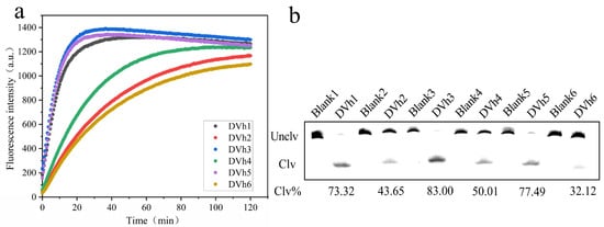Activity of candidate DNAzymes: (a) fluorescence intensity (DVh1–6 reacted with CEM-Vh); and (b) results of candidate 15% dPAGE (DVh1–6 reacted with CEM-Vh, Blank1–6 mean DVh1–6 reacted without CEM-Vh).