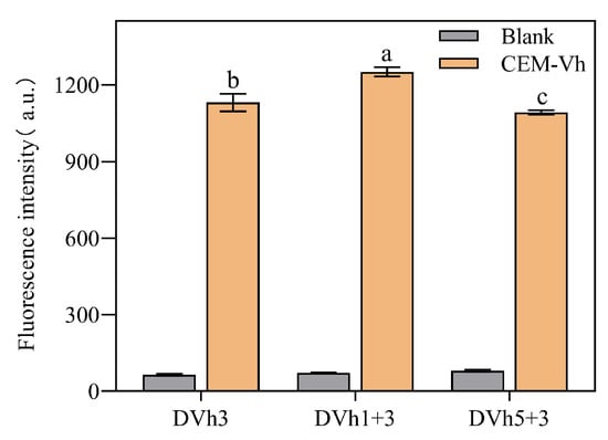 Differences between the fluorescence intensity signals of single and dual DNAzymes. (Blank means without adding CEM-Vh, CEM-Vh means adding CEM-Vh. Different letters indicate statistically significant differences (p < 0.05), while identical letters indicate insignificant differences (p > 0.05)).