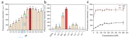As shown in Figure 4a, DVh3+1 showed the highest cleavage activity at pH 8.0. Therefore, subsequent experiments were performed using buffer solution with a pH of 8.0. EDTA can form a stable soluble metal complex with divalent ions. As shown in Figure 4b, DNAzyme could not exhibit any significant cleavage activity without the assistance of divalent metal ions (EDTA group). This indicated the influence of divalent metal ions on the cleavage activity of the DNAzyme. At the same concentration, the fluorescence intensity signal was the highest in the presence of Mg2+. Therefore, Mg2+ was considered the best divalent ion and used in subsequent experiments. Furthermore, concentrations of Mg2+ and the most common monovalent ion, Na+, were optimized. As shown in Figure 4c, the cleavage activity of DVh3+1 was the highest at a Na+ concentration of 300 mM. Therefore, 300 mM was determined to be the optimal concentration of Na+. Similarly, the optimal concentration of Mg2+ was observed to be 180 mM.