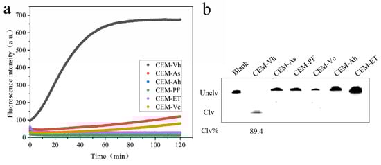 According to previous reports, the targets recognized by DNAzyme are mostly proteins [23]. Therefore, CEM-Vh was cultured at 37 °C for 30 min in presence of five types of proteases (i.e., proteinase K, pepsin, trypsin, bromelain, and alkaline protease at a ratio of 1:1) to completely dissolve the proteins in CEM-Vh; the fluorescence intensity signals of these cultures were monitored for 2 h.