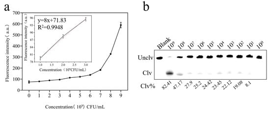 The number of colonies in the initial culture medium of V. harveyi was 4.7 × 109 CFU/mL. The culture method used has been described in 2.1. As shown in Figure 6a, the cleavage activity of DVh3+1 (indicated by the fluorescence intensity) gradually increased with an increase in the concentration of V. harveyi (100–109). The corresponding analytical calibration curve (y = 8x + 71.833, R2 = 0.9944) was plotted based on the fluorescence signals (Figure 6a). The limit of detection (LOD) was 27 CFU/mL, which was calculated as follows: