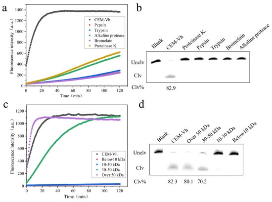 After 1 h treatment with proteinase K, pepsin, trypsin, bromelain, and alkaline protease, the proteins in CEM-Vh were degraded to different extents. As shown in Figure 7a, fluorescence intensities of the CEM-Vh treated with the five proteases were significantly different than the untreated CEM-Vh, which confirmed that the target of DVh3+1 was protein. After 1 h, fluorescence intensities of the protease-treated CEM-Vh samples started to increase, which may be due to the cleavage of remaining non-degraded proteins in CEM-Vh by DVh3+1. Figure 7c shows the fluorescence of the DVh3+1 reaction with CEM-Vh of different molecular weights. CEM-Vh filtrates with 30–50 kDa and over 50 kDa molecular weights could be cleaved by DVh3+1, producing fluorescence. On the other hand, filtrates with less than 30 kDa could not produce a fluorescence intensity signal. The results of 15% dPAGE, shown in Figure 7d, further verified this finding. These results suggested that the protein recognized by DVh3+1 was not a single protein and DVh3+1 could cleave the proteins with molecular weights of 30–50 kDa and over 50 kDa in CEM-Vh.