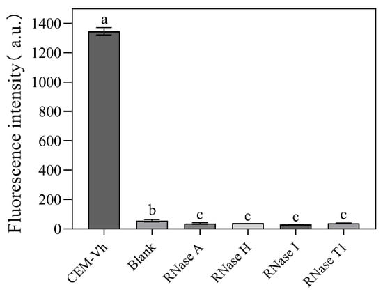 The influence of RNases was assessed to ensure that the cleavage of target was that specifically performed by the DNAzyme, rather than a non-specific cleavage caused by RNase. Four common RNases (RNase A, RNase I, RNase H, and RNase T1) were acquired from Thermo ScientificTM (Waltham, MA, USA). Quantities of 2 μL of each RNase were each added to 198 μL ddH2O for dilution. Quantities of 4 μL DVh3-S, 2 μL DVh1-S, 29 μL ddH2O, and 35 μL of 2× selection buffer were added to the light-resistant 96-well plate. The wells were divided into five groups: control, RNase A, RNase H, RNase I, and RNase T1. A quantity of 30 μL ddH2O was used as blank control, while RNase A, RNase H, RNase I, RNase T1, and CEM-Vh were added into their respective experimental groups. The fluorescence intensity signals were measured for 1 h.