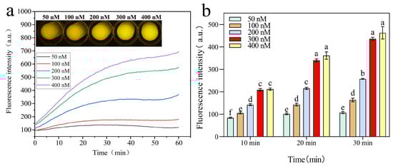 (a) Optimization of the concentration of DVh3+1-S in the dual DNAzyme sensor, with corresponding pictures of fluorescence signal shown at the top. (b) Analysis of significant differences between the fluorescence values of different concentrations of DVh3+1-S at different reaction times. Different letters indicate statistically significant differences (p < 0.05), while the same letters indicate insignificant differences (p > 0.05). The bar represents the mean ± SD.
