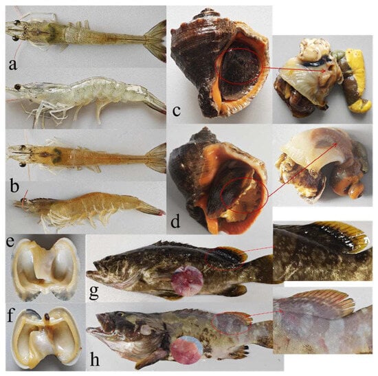 Comparisons of the aquatic products infected by V. harveyi: (a) P. vannamei before infection, (b) P. vannamei after infection 24 h, (c) whelk before infection, (d) Whelk after infection 60 h, (e) C. formosana before infection, (f) C. formosana after infection 48 h, (g) Epinephelus before infection and (h) Epinephelus after infection 50 h.