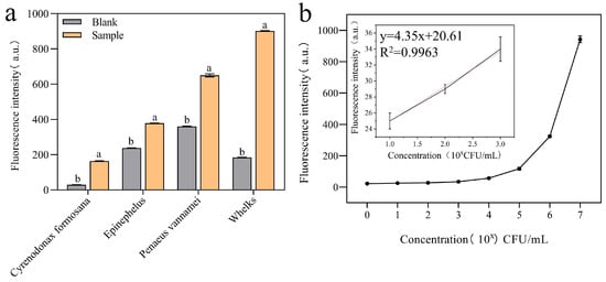 As shown in Figure 11, DVh3+1 showed obvious fluorescence intensity signals in the samples of all four organisms infected with V. harveyi, with whelk showing the highest fluorescence intensity. The whelk group had a lower blank fluorescence background. Therefore, whelk infected with V. harveyi were selected for subsequent detection experiments as described in 2.8. The LOD of sensor for whelk was calculated to be 11 CFU/mL (Figure 11b). This simple sensor can be used for on-site, rapid detection of bacteria.