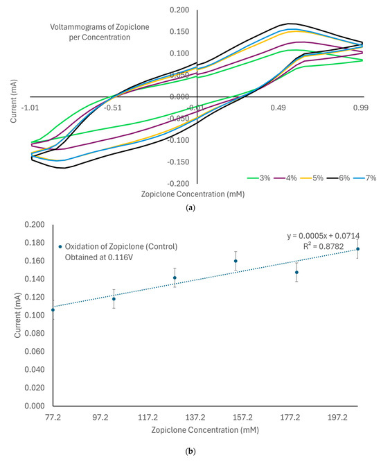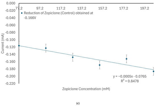 (a) Voltammogram of zopiclone per concentration for concentrations from 3 to 7% (w/v). (b) Curve suggesting the existence of a linear dependence between oxidation current and concentration of zopiclone. (c) Curve suggesting existing linearity between reduction current and concentration of zopiclone.