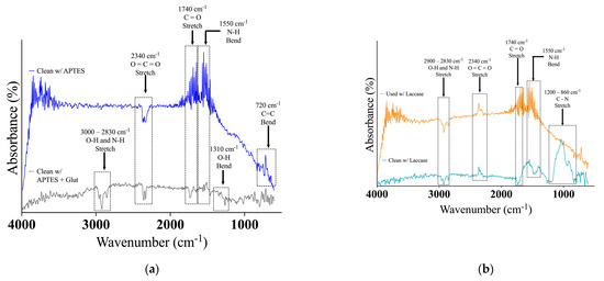 However, a notable distinction was observed in Figure 3a between the APTES and APTES + glut electrodes: the unused APTES + glutaraldehyde electrode displayed a band at 1310 cm−1, corresponding to an O-H bending vibration.