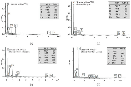 On the other hand, the unused APTES + glut and laccase-immobilized electrodes exhibit the same elemental composition as the unused APTES electrode (Figure 5b,c), with the addition of trace amounts of aluminum. This aluminum could be linked to impurities in the added glutaraldehyde.