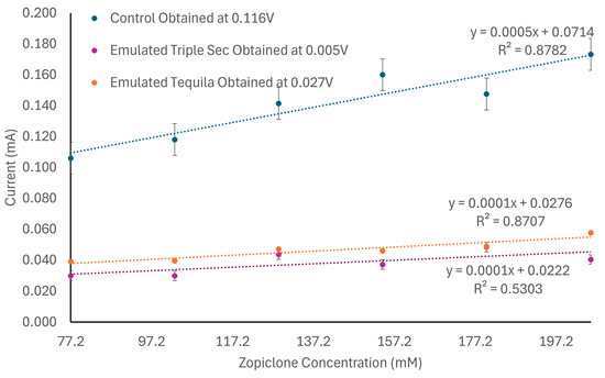 When measuring the different concentrations of zopiclone, the analysis demonstrated that this substance achieved its peak oxidation current at 0.116 V and maximized its linearity when analyzing concentrations between 77.2 mM and 205.8 mM. When measuring concentrations above this, the laccase biosensor quickly saturated; meanwhile, it was undersaturated when measuring concentrations below this range, leading to inconclusive results. As shown in Figure 6, the data obtained for these concentrations indicated that, when in oxidation, the zopiclone control behaves following the formula y = 0.0005x + 0.714 and can achieve an R2 of 0.8782, which implies a sensibility of 0.0005 mA/mM. Furthermore, when testing the interference of ELJ, the laccase biosensor, unfortunately, became saturated, independently of the measured concentration of zopiclone. Therefore, its interference will not be reported.