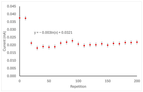 When measuring the cycle of operations of the laccase biosensor using zopiclone, the substance achieved its oxidation point at 0.116 V. In the first repetition, the oxidation current identified was 0.037 mA. After 200 uses, this measurement decreased to 0.022 mA, representing a 40.54% reduction in the measured oxidation current relative to the initial measurement. The degradation of this laccase biosensor is described by the function y = −0.003ln(x) + 0.0321. In the performed measurements, this laccase biosensor did not reach 50% of its capacity (d50), which would have been at 0.0185 mA. Nevertheless, a considerable decrease in performance can be identified after the 20 uses, which can be attributed to the loss of laccase or a decline in its enzymatic activity. Only the wholly assembled sensor was tested, and no tests were performed on its components. This behavior can be seen in Figure 7.