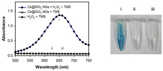Peroxidase-like activity of Ce@SiO2 NGs through the oxidation of TMB in the presence of H2O2. The assay was performed in NaAc buffer (0.1 M, pH 4) containing Ce@SiO2 NGs (0.1 mg/mL) and TMB (1 mM) for 5 min incubation at RT. Sample specifications: i: Ce@SiO2 NGs + H2O2 + TMB, ii: Ce@SiO2 NGs + TMB, and iii: H2O2 + TMB.