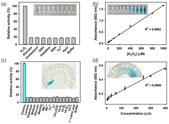 Choline is an essential nutrient for developing the brain and maintaining overall health [1,2,3]. Several diseases, such as Alzheimer’s disease, liver cirrhosis, and growth disorder, were suggested to be induced by long-term choline deficiency [4,5]. Usually, the body can restore choline through food intake, and, thus, accurate determination of choline in foods is an important issue. The US Food and Drug Administration (FDA) as well as the food and nutrition board (FNB) of the institute of medicine thus set regulations that infant formula not made from cow’s milk must be supplemented with a high choline concentration (up to 200 mg/100 g sample), which is equivalent to that of breast milk (~1 mM) [6]. In addition, H2O2 is commonly used as a disinfectant in food preservation; however, its excessive levels can pose health risks, such as oxidative stress and tissue damage [7,8]. Therefore, ensuring accurate quantification of choline as well as H2O2 in foods is essential for maintaining health standards and meeting dietary needs [6,9]. The traditional detection methods for choline and H2O2, such as high-performance liquid chromatography (HPLC) and fluorescence-based techniques, are generally selective and sensitive. However, these approaches present several challenges, including time-consuming sample pre-/post-treatment, interference from background signals, and the inevitable use of complicated instrumentation [7,10,11]. Thus, the development of more convenient, reliable, and sensitive methods for detecting choline and residual H2O2 is vital to overcome these limitations and improve food safety and nutritional assessments.