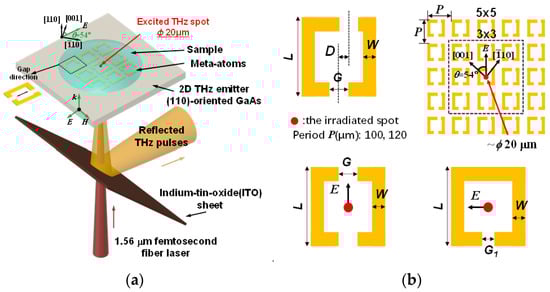 A series of meta-atom structures with varying array numbers, periods and offset distances, as shown in Figure 1b, were prepared to investigate their reflective properties. These structures were fabricated on a 500 µm thick, (110)-oriented GaAs substrate, known for its nonlinear optical properties conducive to THz generation via optical rectification [71], which depends on the polarization of the incident laser [52,72]. The fabrication process started with the deposition of a 1 nm thick titanium adhesion layer onto the GaAs substrate, followed by sputtering of a 200 nm thick gold layer using conventional photolithography and radio-frequency sputtering techniques. Appropriate structural parameters were carefully selected to achieve the resonance response in the studied THz region. After fabrication, the meta-atom structures were inspected under an optical microscope to check for any fabrication defects, ensuring that only defect-free structures were used for actual measurements.