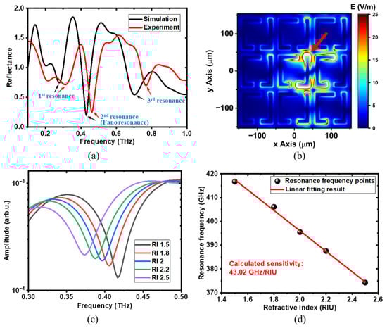 Reflective resonance analysis with the meta-structure arrayed in a 5 × 5 pattern with a period of 100 µm and gap offset distance of 20 µm. (a) The calculated and measured reflectance spectra. There main resonances are observed: 1st resonance, 2nd resonance (Fano resonance), and 3rd resonance, which are indicated by black and red arrows for simulation and experiment, respectively. (b) The corresponding electric field distribution of the 2nd resonance (Fano resonance) at 0.425THz. A strong electric filed coupling region was observed around the shorter rod, as the red arrow indicates. (c) The calculated 2nd resonance frequency spectra of the meta-structure immersed in materials with different refractive indices. (d) The calculated resonance frequency versus refractive index with a linear fitting result. The evaluated sensitivity is 43.02 GHz/RIU.