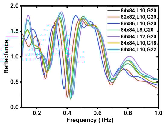 For metamaterial structures, the resonance response is influenced by several factors, demonstrating its tunability and accounting for the discrepancies between the simulated and measured results shown in Figure 2a. It is well known that resonance response characteristics are highly sensitive to geometric sizes. Figure 3 presents the calculated reflectance spectra of the geometric size dependence. The overall size (L) of a single meta-atom was set to three configurations: 82 μm × 82 μm, 84 μm × 84 μm and 86 μm × 86 μm. Similarly, three different line widths (W) were considered, 8 μm, 10 μm and 12 μm, along with three gap sizes (G): 18 μm, 20 μm and 22 μm. Each case involved altering only one parameter relative to the original design, forming a total of seven combinations. From the calculated spectra, noticeable shifts in the resonance frequency were observed regardless of which parameter was altered. These three parameters can sensitively change the electric field distribution and, thus, the coupling state, resulting in shifts in the resonance frequency. In actual measurements, the geometry of the fabricated meta-atom structure generally deviates from the designed parameters used in the simulation, which is a key factor contributing to the discrepancy between the simulation and experimental spectrum shown in Figure 2a (Figure S6 in the Supplementary Materials).
