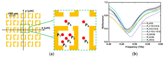 In our case, the meta-structure was excited in the near field using a point THz source. The position of the point THz source directly affects the excitation state of the meta-atoms, thereby affecting the resonance response. Figure 4 displays the reflectance response depending on the excitation positions of the THz sources. The same meta-atom structure as that shown in Figure 2, arranged in the 5 × 5 arrays of meta-atoms with a meta-atom period of 100 μm and a gap offset distance of 20 μm, was selected as the example structure. Seven different excitation positions of the THz point sources were examined, as shown in Figure 4a. The origin P0(0, 0) is set at the center of the central meta-atom, and the XY coordinates are adjusted to match the scale of the meta-atom array. Four points—P0(0,0), P1(−12.5, 12.5), P2(12.5, 12.5) and P3(−12.5, −12.5)—were located within the central meta-atom, while three points—P4(50, 50), P5(0, 50) and P6(50, 0)—were positioned between meta-atoms. The size of the red dot was the same as that of the THz point source. The corresponding reflectance spectra for each excitation point are displayed in Figure 4b, where clear shifts in the resonance frequency and changes in amplitude were observed. From the experimental results, the position of the resonance response remained largely unaffected by changes in the excitation point within the meta-atom unit, indicating minimal dependence on its precise location. However, when the laser was focused outside the meta-atom unit, slight reductions in the Q-factor were observed. For optimal resonance and sensitivity, it is preferable to position the excitation point within the meta-atom unit. Since the excitation occurs in the near-field, the resonance response is more sensitive to structural and excitation variations compared to that in the far-field technique. The resonance response is determined by the coupling between meta-atoms. Similar results were found in the simulation (Figure S7 in the Supplementary Materials). In the experiments, positioning of the focused laser beam spot was achieved by laser reflection imaging, which introduced positioning errors and also contributed to the above-mentioned discrepancy between the calculated and measured results.
