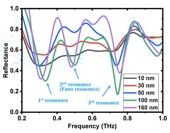 The thickness of the meta-atoms is another important parameter affecting the resonance response. Figure 5 demonstrates the measured thickness dependence, including the reflectance and transmittance spectra (Figure S8 in the Supplementary Materials). The thickness of the meta-structure ranged from 10 nm to 160 nm, which was controlled by varying the sputtering time. As the thickness decreases, the intensity of the resonance response becomes progressively weaker in both the reflection and transmission modes. This is because as the structure’s thickness decreases, the equivalent resistance of the structure is enhanced, resulting in weaker currents generated. This reduction in current lowers the strength of the electric field in the coupling region, diminishing the coupling effect and ultimately weakening the resonance response [74]. With a thickness of 160 nm, a strong resonance peak can be observed. As the thickness decreases to 10 nm, the Fano resonance nearly vanishes. For sensing applications, adequate resonance strength is essential. It is evident that a thickness over 50 nm yields a significant resonance response, implying that there is a thickness limitation for strong resonance. In addition, as the thickness changes, a slight resonance frequency shift can also be observed, which is also one of the reasons for the discrepancies between the simulated and experimental results.