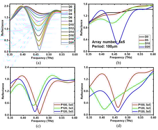 To further explore the reflective characteristics and tunability of the resonance response, several design parameters were investigated, including the gap offset distance, array number and period. Figure 6a demonstrates the calculated reflectance spectra for the gap offset distance ranging from 0 μm to 20 μm in 2 μm increments. The array number and period are fixed at 5 × 5 and 100 μm, respectively. Notably, as the gap offset distance increases, the 2nd resonance grows progressively stronger. Structural symmetry breaking leads to a more concentrated electric field distribution, as indicated in the coupling region around the shorter rod of the meta-structure in Figure 2b. As the asymmetry increases and the shorter rod shortens, the electric field in that region intensifies, ultimately enhancing the resonance response. Figure 6b displays the corresponding measured results with changing gap offset distance from 0 μm to 20 μm with a step of 5 μm. From the experimental results, resonance peaks were only observed at gap offset distances of 10 μm and 20 μm, with a significantly stronger resonance response at 20 μm, which agreed well with the simulation results. The absence of resonance peaks at 0 μm and 5 μm is attributed to the weakness of the resonance response under these conditions. Consistent with the simulation, the resonance response was weak when the gap offset distance was less than 6 μm.