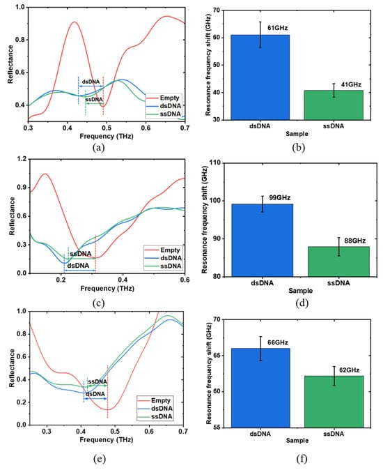 dsDNA and ssDNA measurements. Reflectance spectra (a,c,e) of the meta-sensor with and without dsDNA and ssDNA in a single measurement. Average resonance frequency shifts (b,d,f) of dsDNA and ssDNA of ten measurements. (a,b) are the results of double-gap asymmetrical meta structure. (c,d) are the results of double-gap symmetrical meta structure. (e,f) are the results of single-gap symmetrical meta structure. The concentration of the measured dsDNA and ssDNA are 100 µg/mL. The array number and period of the three meta-structures are set as 5 × 5 and 100 µm, respectively.