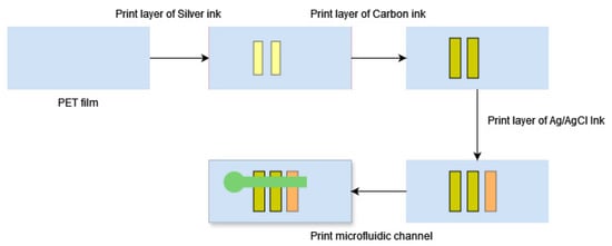 23]. In the latter ones, microfluidic channels are embedded in the paper and electrodes sit on the paper. In comparison with the fabrication of ePADs, printing electrodes on smooth PET films and integrating them with the printed microfluidic channels is more suitable for volume production. Firstly, low-resistance electrodes can be easily printed in a single pass using commercial conductive carbon inks and Ag/AgCl inks. Secondly, well-defined electrodes with sharp edges and small electrode-to-electrode gaps at 150-200 μm can be repeatedly printed, in high volume using screen printing, on polymer films [