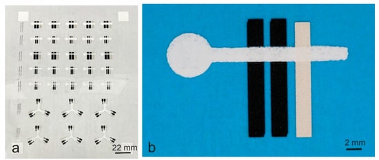 The all-printed microfluidic–electrochemical devices are fabricated by printing to establish the contact of electrodes with microfluidic channels. A strong bonding is naturally formed through the polymer in the printed materials after the involved solvent is evaporated. This integration method is much simpler than that of attaching a microfluidic slab to an electrode-ready surface and is suitable for volume processing at a low cost. It is also different from that of printing electrodes onto paper, as described in the Introduction Section, resulting in a structure different from paper-based devices (i.e., ePADs). In the all-printed ones, the electrodes lay on PET films and the free-standing microfluidic channels sit over the electrodes and the PET films, which serve as protective substrates [
