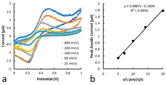 Figure 4b indicates that the analytes follow the Randles-Sevcik equation, and the potassium ferricyanide can freely diffuse within the printed microfluidic channel [