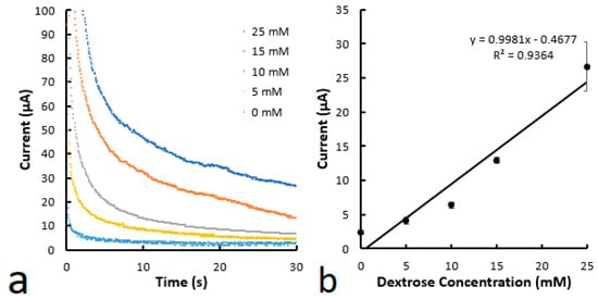 Figure 5b). The calibration curve shows that the current is linearly proportional to the glucose concentration in the tested range. A limit of detection (LOD) of 0.24 mM was determined following the method previously reported [