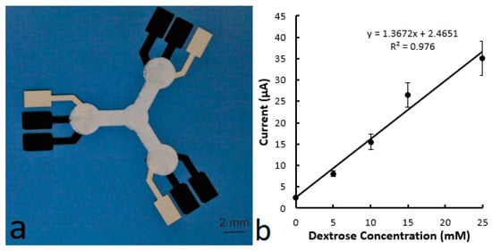 Figure 9) by capillary action. All the materials used for fabricating the devices are commercial, off-the-shelf, and low-cost, and the involved semi-automatic printing processes can be easily scaled up for volume production. This study has demonstrated that printing capillary microfluidic channels on electrodes deposited on a smooth and dense surface is a simple, low-cost, and scalable way of integrating electrodes with microfluidic channels. This advantage is further supported by the testing results that an LOD of 0.007 mM or 7 μM for glucose detection can be obtained for the devices using bare carbon and Ag/AgCl electrodes without any chemical modification.