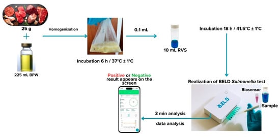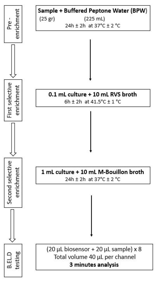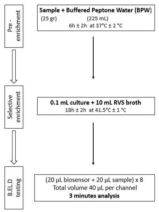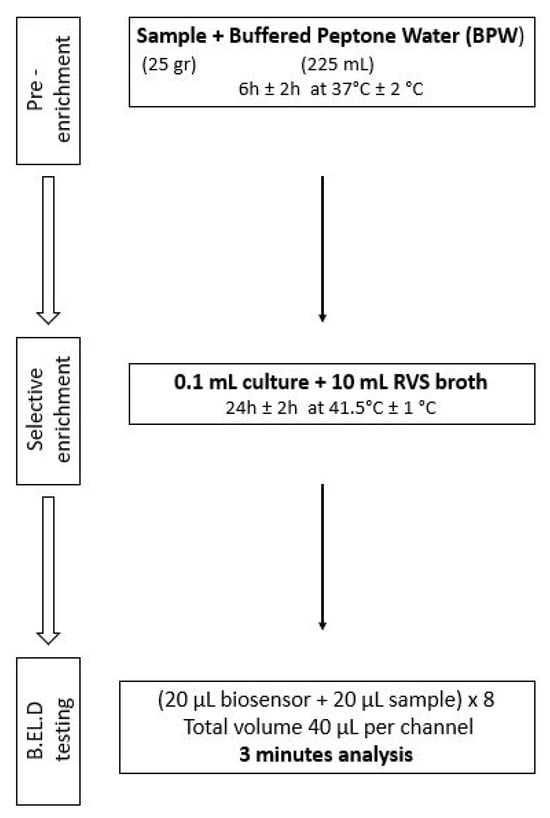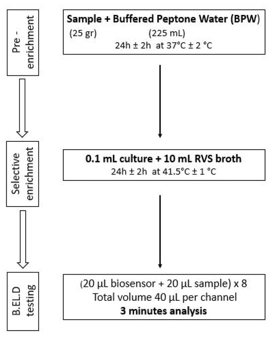 Protocol 1: Briefly, 25 g of each sample (inoculated or not) were homogenized with 225 mL of BPW in a sterile Stomacher bag. The suspension was incubated for 24 h at 37 °C. After the incubation, 0.1 mL of the suspension was inoculated into 10 mL of Rappaport–Vassiliadis–Soya (RVS) and incubated for 24 h at 41.5 °C. The next day, a portion of the incubated suspension was tested with the biosensor, as described above. In addition to the biosensor analysis, the samples were also examined with the ISO 6579-1:2017 [16] using the selective Xylose Lysine Deoxycholate agar (XLD) for results validation. In the case of uninoculated samples (control samples), the presence of presumptive Salmonella spp. colonies, was further investigated through biochemical tests using API20E.
