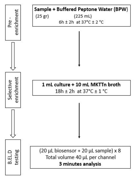 The validation of the newly developed biosensor system on food was achieved by comparing and evaluating seven different protocols. For the seven protocols evaluated in this study, four different enrichment and pre-enrichment broths (RVS, MKTTn, M broth and BPW) were used with different combinations each time and a different incubation time for each stage of the protocol. BPW is suitable for the preliminary non-selective enrichment of bacteria, especially pathogenic Enterobacteria such as Salmonella and Cronobacter, from food, water, and other materials. It is also rich in nutrients and produces high rates of regeneration for sub-lethal injured bacteria and vigorous growth. The phosphate buffer system prevents bacterial damage caused by changes in the pH of the medium [31]. Both RVS and MKTTn are selective enrichment broths used for the isolation of Salmonella. They selectively promote the growth and multiplication of Salmonella, while simultaneously inhibiting the growth of other bacteria that happen to be present in the sample [31,32,33]. M broth is a general-purpose enrichment broth used for the cultivation of a variety of microorganisms. M Broth can be used for the detection of Salmonella, but it is not as selective as RVS or MKTTn [34].