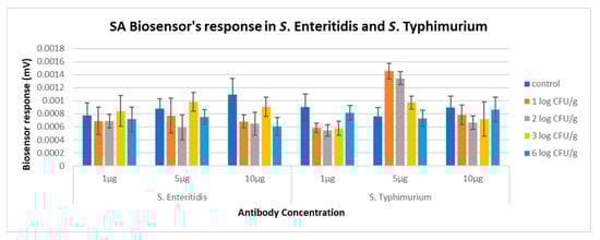Biosensor response in various antibody SPA concentrations in S. Enteritidis and S. Typhimurium broth samples.