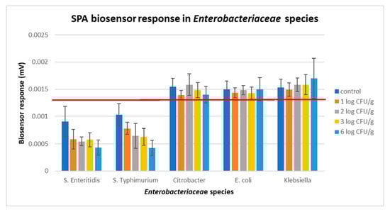 Biosensor response in presence of Enterobacteriaceae species. The red line indicates the significant difference in the biosensor response generated in the presence of Salmonella spp. compared to other species of the Enterobacteriaceae family.