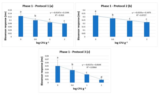 Phase 1: Biosensor response in protocol 1 (a), protocol 2 (b), and protocol 3 (c) in samples without Salmonella spp. (0 log CFU g−1) and with Salmonella spp. at 0.6, 1, and 2 log CFU g−1 (initial inoculation level). The error bars represent the standard errors of the mean value of all replications. The columns marked with different letters indicate that the response was significantly (p < 0.05) different from the respective one obtained from control samples.