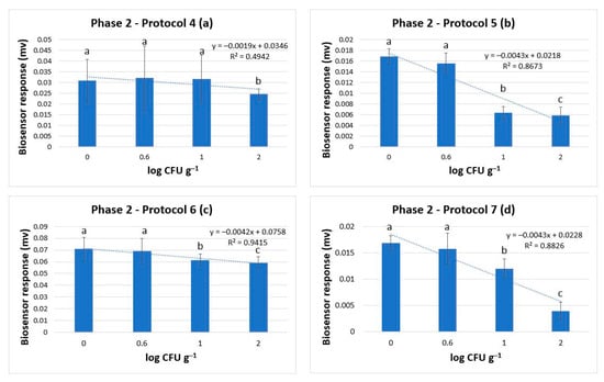 Phase 2: Biosensor response in protocol 4 (a), protocol 5 (b), and protocol 6 (c), and protocol 7 (d) in samples without Salmonella spp. (0 log CFU g−1) and with Salmonella spp. at 0.6, 1, and 2 log CFU g−1 (initial inoculation level). The error bars represent the standard errors of the mean value of all replications. The columns marked with different letters indicate that the response was significantly (p < 0.05) different from the respective one obtained from control samples.