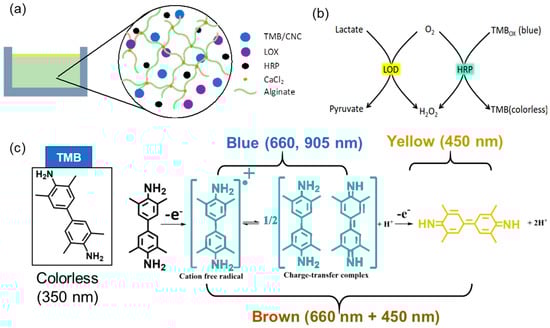Figure 1a illustrates the construction of the alginate-based hydrogel and its lactate detection mechanism. The hydrogel was created by integrating essential components: TMB-loaded cellulose nanocrystals (CNC), lactate oxidase (LOX), horseradish peroxidase (HRP), and sodium alginate. Alginate was selected for its biocompatibility and capacity to create a durable hydrogel matrix through ionic crosslinking with calcium ions (Ca2), so ensuring structural integrity and preserving the active components inside the gel. LOX and HRP, encapsulated inside the matrix, are crucial for the enzymatic cascade required for lactate detection. To prevent the leaching of TMB, which is a small molecule, TMB was first loaded onto negatively charged CNC. CNCs are nanoparticles about 20 nm in diameter and 200 nm in length [41]. LOX and HRP are macromolecules with molecular weights of approximately 80 kDa and 40 kDa, respectively, which considerably exceed the sizes of small analytes like lactate (90 Da) and oxygen (32 Da). The alginate-based hydrogel used in this investigation was engineered to entrap the enzymes while allowing the efficient transport of small analyte molecules. The mesh size of the alginate network was adjusted by optimizing the alginate content and crosslinking density during preparation [42,43]. Furthermore, the enzymes LOX and HRP were pre-mixed with alginate prior to gelation. Non-covalent interactions, such as hydrogen bonding and electrostatic interactions between the enzymes and alginate, are expected to be strong. Consequently, the enzymes are further retained through polymer entanglement. No noticeable leakage of LOX and HRP was observed.