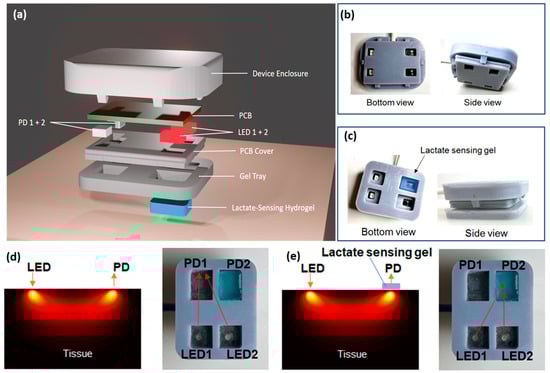 The device depicted in Figure 3a incorporates modern sensor technologies into a compact, wearable format for real-time, non-invasive, and concurrent monitoring of lactate and tissue oxygenation. It consists of two major functional components: the hydrogel-based lactate sensor and the near-infrared (NIR) sensor, both crucial for monitoring biochemical and physiological alterations in the body [47]. The device enclosure was precisely designed to facilitate secure integration of various components, guaranteeing durability, adaptability, and user-friendliness for ongoing wearable monitoring. This enclosure was 3D printed using a DLP printer, ensuring easy customization and high-resolution fabrication. The device enclosure comprised three essential parts: a top cover, a PCB cover, and a gel tray, all of which were assembled to provide structural integrity and facilitate the placement of the hydrogel sensor.