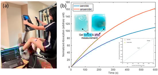 (a) Picture of the test setup showing the device worn on the researcher’s left thigh while on a stational bike, with the laptop running data collection software. (b) Normalized absorption vs. time response curves for the aerobic and anaerobic conditions. Inset-left up: appearance of gel before and after the test; inset-right down: lactate detection calibration curve.