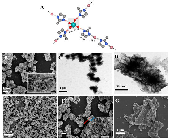 (A) Coordination process, (B) SEM image, and (C,D) TEM images of Co/Mo-MOF. And SEM images of (E) CdS NPs, (F) CdS@Co/Mo-MOF, and (G) g-C3N4.
