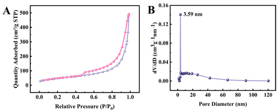 (A) N2 adsorption/desorption isotherms and (B) pore size distribution plot of Co/Mo-MOF.