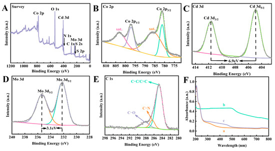 (A) Survey XPS spectrum of the CdS@Co/Mo-MOF, and high-resolution XPS spectra of (B) Co 2p, (C) Cd 3d, (D) Mo 3d, and (E) C 1s. And (F) UV–vis spectra of different materials (Co/Mo-MOF (a), CdS (b), and CdS@Co/Mo-MOF (c)).