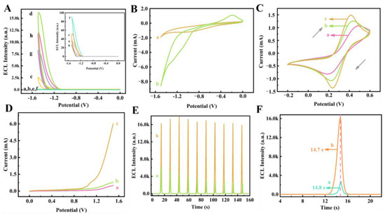 ECL assays were performed in 0.1 M PBS containing 7 mM K2S2O8 and varying concentrations of CPH using an MPI-E type ECL workstation (Xi’an Remex Analytical Instrument Co., Ltd., Xi’an, China). All ECL tests were performed in a three-electrode system (Pt wire as the auxiliary electrode, saturated potassium chloride solutions electrode as the reference electrode, and GCE as the working electrode). The potential scanning range was −1.5–0 V, the scanning rate was 0.2 V/s, and the photomultiplier tube (PMT) was set to 500 V.