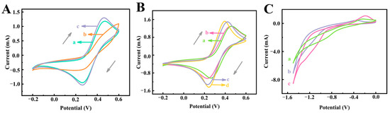 The CV behaviors of (A) ZIF-67 synthesized by the different solvent system (M-ZIF-67/GCE (a), D-ZIF-67/GCE (b), and H-ZIF-67/GCE (c)) and (B) various modified (H-ZIF-67/GCE (a), CdS NPs/GCE (b), Co/Mo-MOF/GCE (c), and CdS@Co/Mo-MOF/GCE (d)) in 0.1 M KCl solution containing 5 mM [Fe(CN)6]3−/4−. And (C) CV behaviors of different modified electrodes (H-ZIF-67/GCE (a), Co/Mo-MOF/GCE (b), and CdS@Co/Mo-MOF/GCE (c)) in 7 mM K2S2O8 solution.